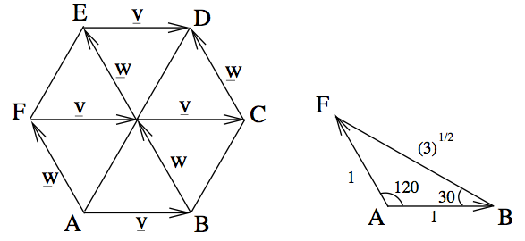 Let \(ABCDEF\) be a regular hexagon with sides of length 1. Let \(\hat{{\mathbf{v}}}\) and \(\hat{{\mathbf{w}}}\) correspond to 2 adjacent sides, \({\overrightarrow{AB}} = \hat{{\mathbf{v}}}\), \({\overrightarrow{AF}} = \hat{{\mathbf{w}}}\) (where \(A\) is the bottom left point, and \(A,B,C....\) proceed anti-clockwise.)