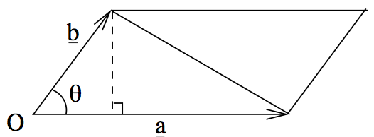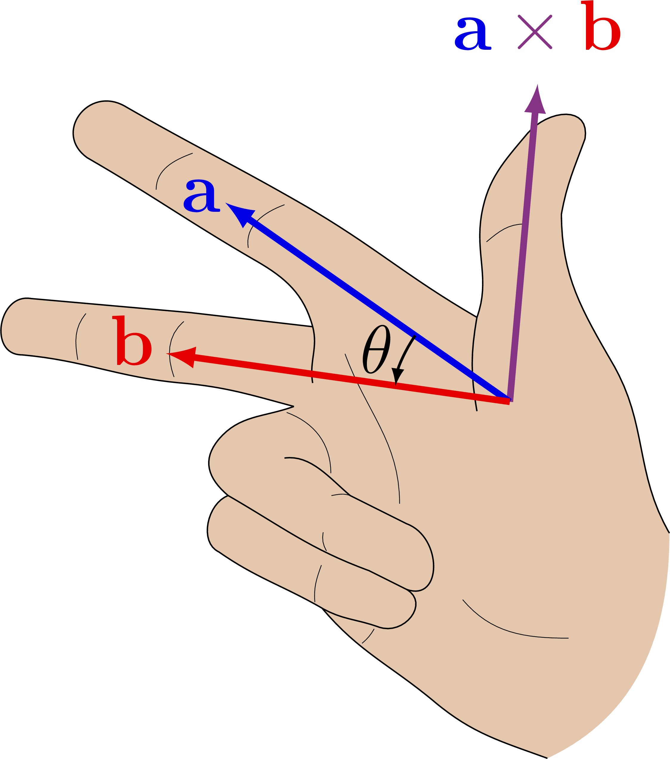 - The magnitude of the result \(|{\mathbf{a}}\times{\mathbf{b}}| = |{\mathbf{a}}||{\mathbf{b}}|\sin\theta\).