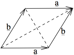 It’s a paralellogram, so \({\overrightarrow{AB}}={\overrightarrow{DC}}\) - let’s call this \({\mathbf{a}}\) - and \({\overrightarrow{BC}}={\overrightarrow{AD}}={\mathbf{b}}\).