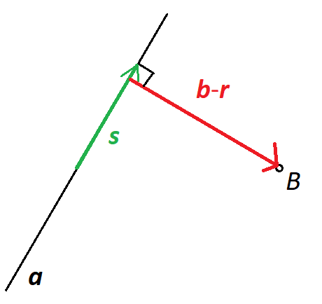 Remember that perpendicular means the dot product of the vectors is zero. So we need \[ \left({\mathbf{b}}-{\mathbf{r}}\right)\cdot{\mathbf{s}} = 0, \] i.e. \[ \left({\mathbf{b}}-{\mathbf{a}} - \lambda{\mathbf{s}}\right)\cdot{\mathbf{s}} = 0. \] The only unknown thing in this equation is \(\lambda\). Rearranging we find \[ \lambda = \frac{\left({\mathbf{b}}-{\mathbf{a}}\right)\cdot{\mathbf{s}}}{|{\mathbf{s}}|^2}, \] and so the position on the line nearest the point \(B\) is given by \[ {\mathbf{r}} = {\mathbf{a}} + \frac{\left({\mathbf{b}}-{\mathbf{a}}\right)\cdot{\mathbf{s}}}{|{\mathbf{s}}|^2}{\mathbf{s}}. \] Finally, we can calculate the distance of the point from the line as \[ \left|{\mathbf{b}}-{\mathbf{r}}\right| = \left|{\mathbf{b}}-{\mathbf{a}} - \frac{\left({\mathbf{b}}-{\mathbf{a}}\right)\cdot{\mathbf{s}}}{|{\mathbf{s}}|^2}{\mathbf{s}}\right|. \] Everything here is known, so you can compute this. You could learn this as a formula, but it’s better to understand the process.