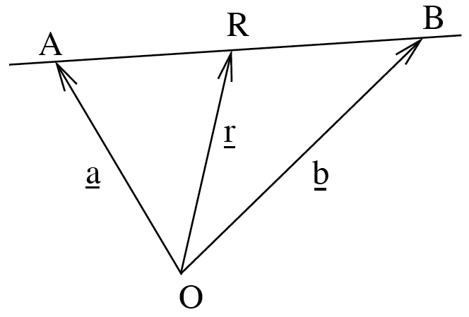 Now we don’t know the direction of the line, but we can easily find it as the displacement vector \({\overrightarrow{AB}}={\mathbf{b}}-{\mathbf{a}}\).
