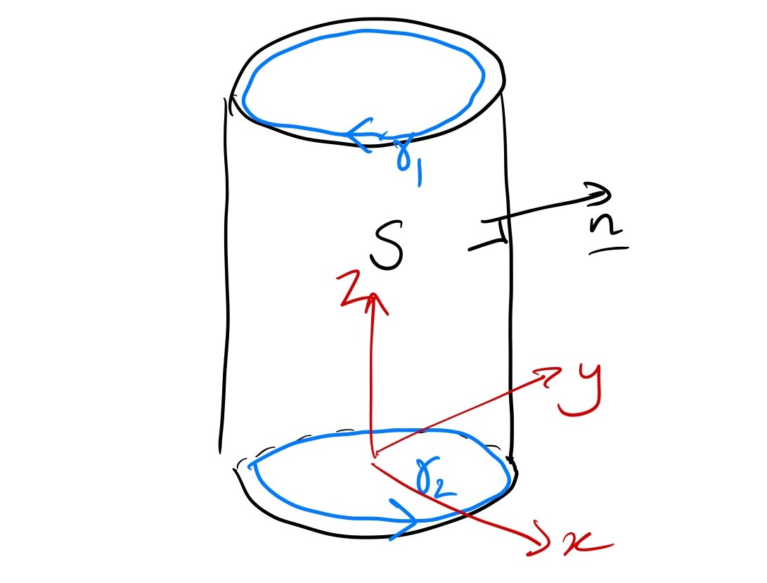 We need to evaluate \[ \int_{\partial S} [z^2,x^2,y^2] \cdot d{\mathbf{s}}, \] but crucially \(\partial S\) has two parts, that we will call \(\gamma_1\) and \(\gamma_2\), and we write \(\partial S = \gamma_1+\gamma_2\).